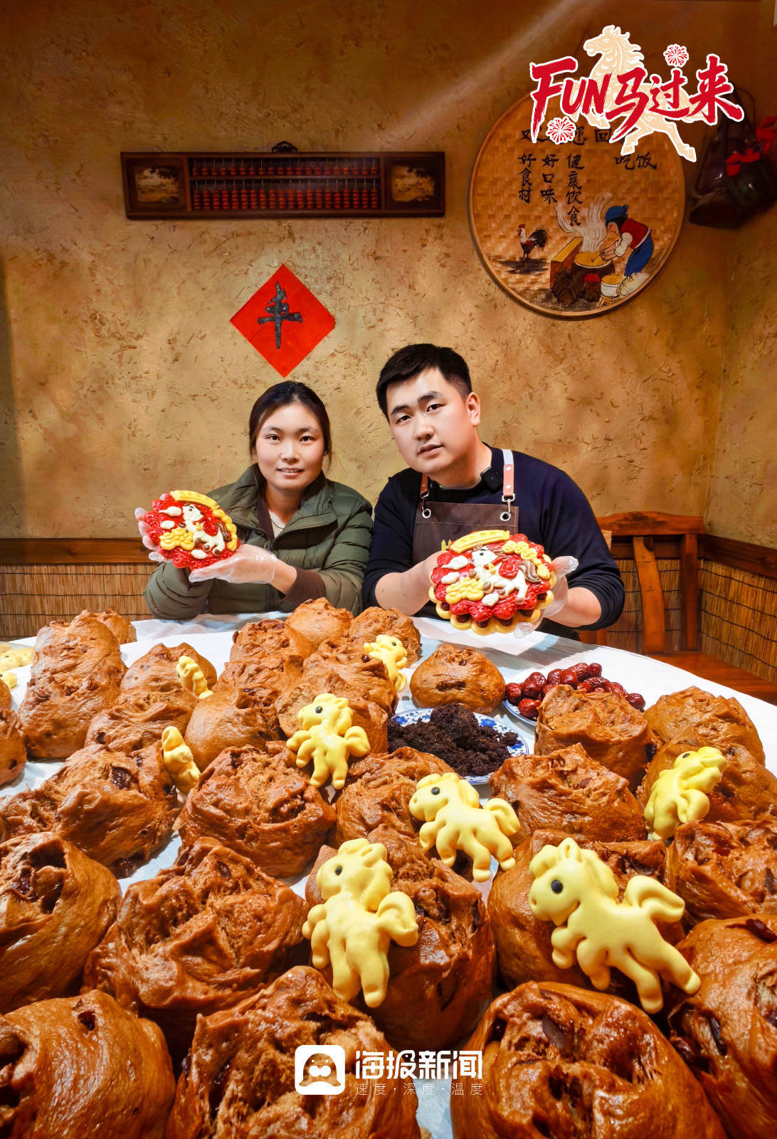 周宵宵(左)与刘志文(右)正在展示马年主题面食