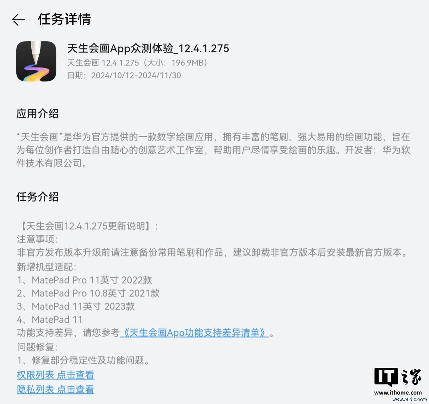 IT之家 10 月 12 日音问,今天发布了新的“天生会画”App 众测体验任务,众测日历为 10 月 12 日至 11 月 30 日,版块号为 12.4.1.275,新增了 4 款适配机型。