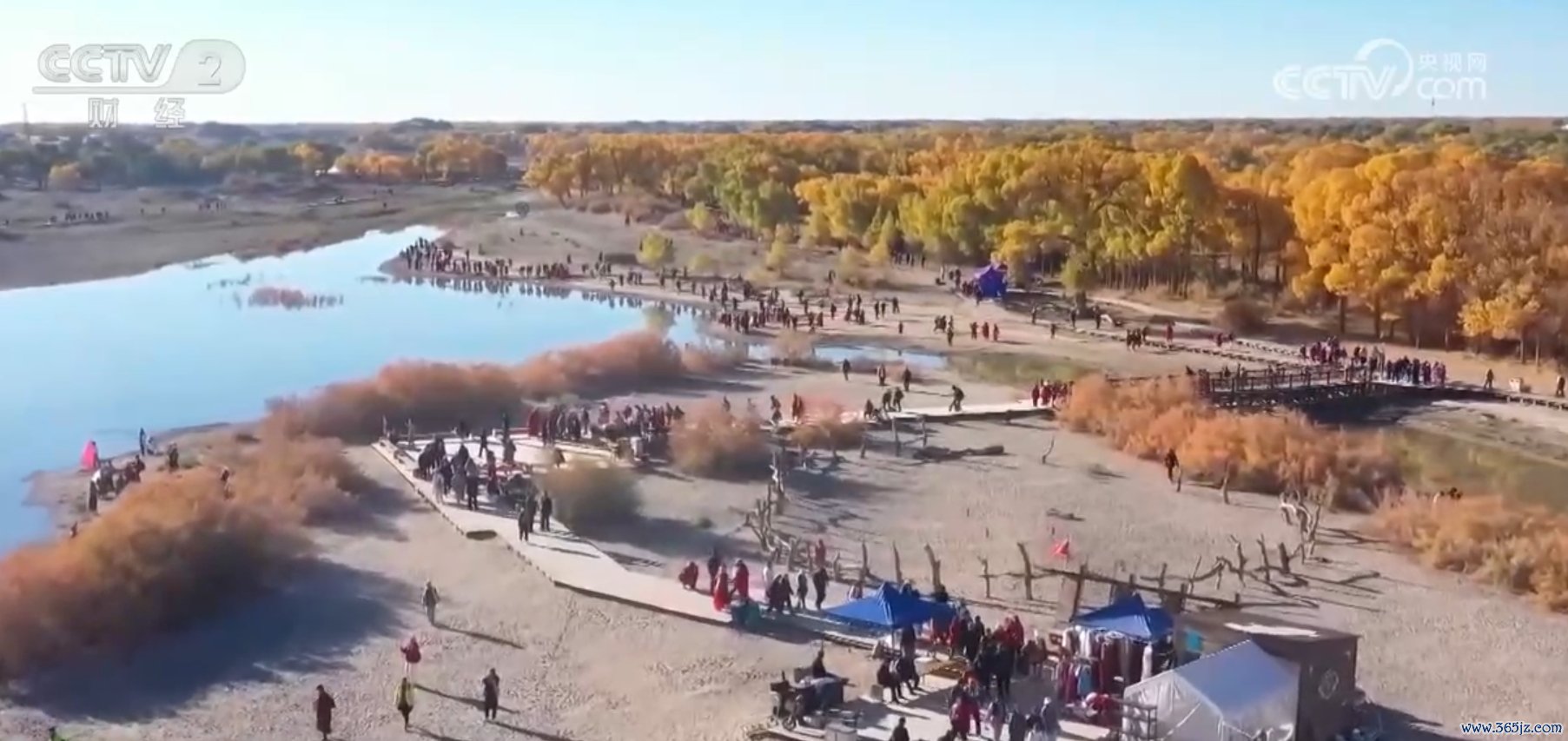 在阿拉善盟额济纳旗胡杨林景区,大片的胡杨树叶已酿成金黄色,前来赏景的旅客联翩而至。