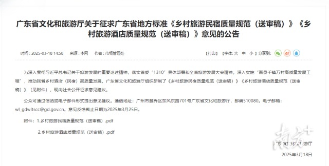 日前,广东省文化和旅游厅发布了广东省场地模范《乡村旅游民宿质料模范(送审稿)》以及《乡村旅游旅社质料模范(送审稿)》,并向社会平庸征求倡导。公众可在3月25日前通过信函或电子邮件表情提议倡导建议。