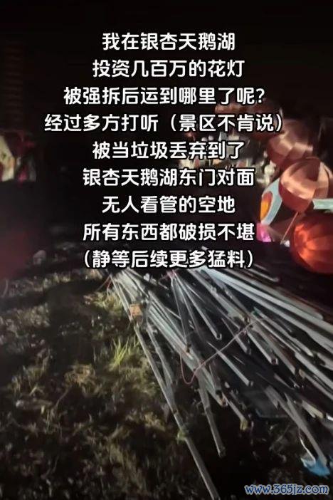 10 月 21 日,有网友在发布视频,称我方在浙江嘉兴银杏天鹅湖投资几百万的花灯,被废除后运走,当成垃圾丢弃在湖东门对面无东说念主扶植的旷地,通盘东西齐壅塞不胜。