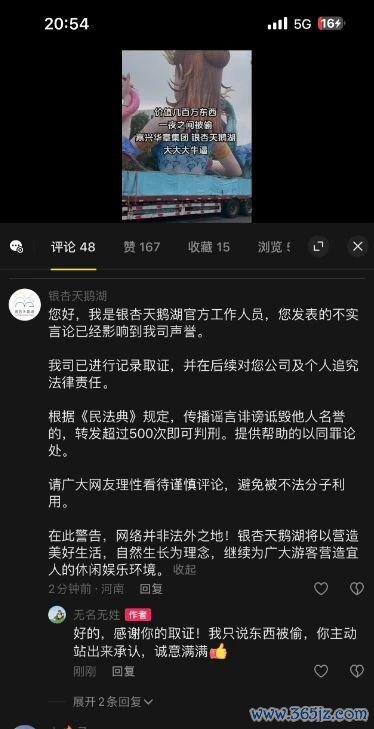 在陈先生发布的视频评述区,银杏天鹅湖官方账号对此事进行了回报:您发表的伪善言论依然影响到我司声誉,我司已进行记考取证,并在后续对您公司及个东说念主根究法律牵累。该账号为实名认证,认证主体为"嘉兴灵粮生态农业有限公司"。