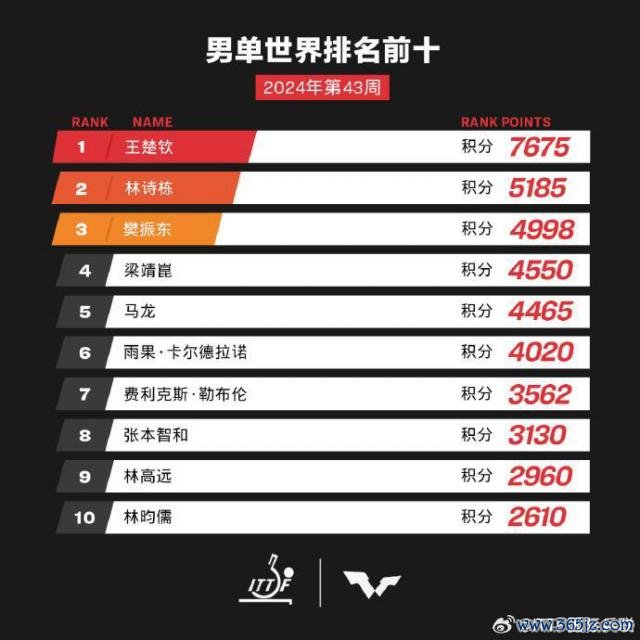 22 日,外洋乒联发布 2024 年第 43 周天下排名。