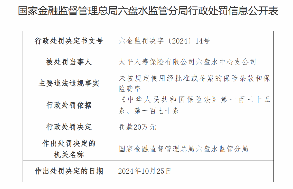 11月5日,据国度金融监管总局官网裸露,因未按限定使用经批准或备案的保障要求和保障费率,太平东谈主寿保障有限公司六盘水中心支公司被国度金融监督照管总局六盘水监管分局罚金20万元;同期,因对这一作恶非法事实负有包袱,时任太平东谈主寿保障有限公司六盘水中心支公司副总司理李杰被教化并处罚金4万元。