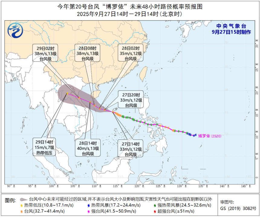 中央花样台在9月27日15时对“博罗依”的旅途和强度预告