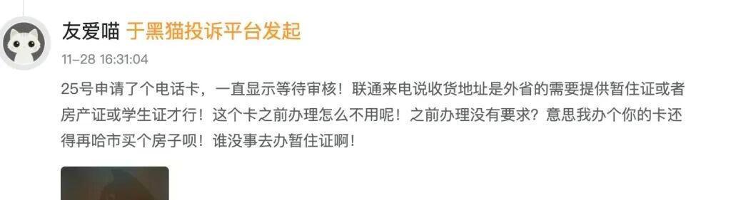有网友于2024年11月投诉中国联通称,其央求电话卡后,联通回电说成绩地址是外省的需要提供暂住证概况房产证或学生证才行。“这个卡之前办理怎么莫得这些要求呢?我办个卡还得再买个屋子呗,谁没事去办暂住证啊。”该网友吐槽说念。